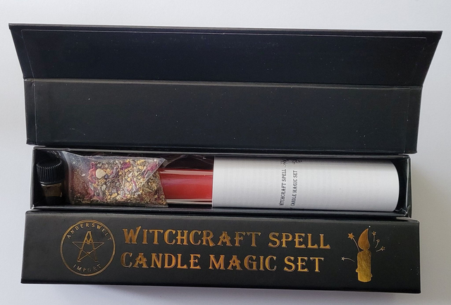 Set composta da candela per incantesimi d'amore con olio magico speciale, miscela di erbe, candela a bastoncino colorata e istruzioni in tedesco, inglese, francese e italiano.
