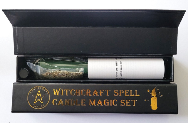 Set composto da candela per incantesimi di successo con olio magico speciale, miscela di erbe, candela a bastoncino colorata e istruzioni in tedesco, inglese, francese e italiano.