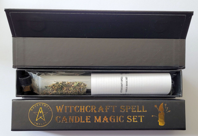 Set composto da candela per incantesimi di protezione con olio magico speciale, miscela di erbe, candela a bastoncino colorata e istruzioni in tedesco, inglese, francese e italiano.