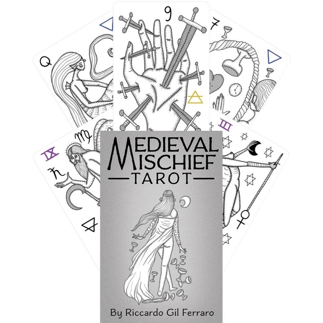 Con un fascino per il Medioevo, il designer italiano Riccardo Gil Ferraro ha creato un mazzo completamente originale con un'estetica medievale moderna. Avendo collezionato tarocchi esoterici e in stile marsigliese, Ferraro era intenzionato a creare un mazzo per i lettori di oggi. Medieval Mischief Tarot fornisce correlazioni elementali e astrologiche all'interno di disegni stravaganti su carte senza bordi e senza titolo. Re, cavalieri, damigelle e demoni ti mostrano la via verso la conoscenza di te stesso. Include 78 carte, una chiave magnetica con simbolo bonus e una guida di 60 pagine.Include: 78 carte.Dimensioni delle carte: 5,7 x 9,5 cm (2,25" x 3,75"). Peso del mazzo: 226 g. (circa) .Include libretto di istruzioni (in inglese) .Carte da gioco in carta patinata plastificata